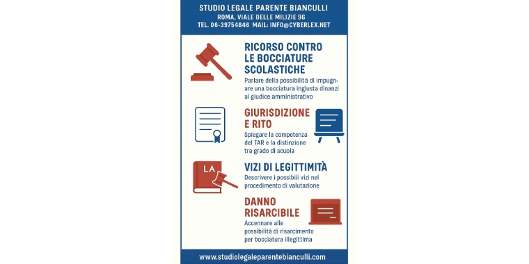Il ricorso contro una bocciatura spetta al Tribunale Amministrativo Regionale competente per territorio, ai sensi dell’art. 7 del Codice del processo amministrativo. Avv. Domenico Bianculli: “il provvedimento di non ammissione incide su un interesse legittimo e rientra quindi nella giurisdizione amministrativa. L’impugnazione deve essere proposta entro sessanta giorni dalla pubblicazione ufficiale degli esiti o dalla comunicazione formale della decisione. Il rito è quello speciale abbreviato previsto dall’art. 119 c.p.a., che consente una definizione più rapida della controversia, data la delicatezza del diritto allo studio e la necessità di tempi compatibili con l’avvio dell’anno scolastico successivo.”