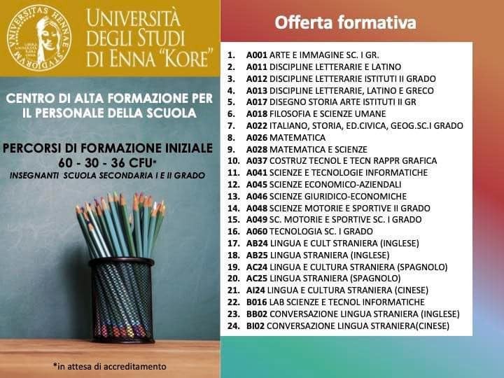 Tramite un post sulla propria pagina Facebook ufficiale, l’Università Kore di Enna ha annunciato di aver ricevuto il decreto di accreditamento per l’attivazione dei percorsi di formazione finalizzati al conseguimento dell’abilitazione. Adesso non resta che attendere il DM, all’interno del quale verranno chiarite le modalità di avvio dei suddetti corsi e quelle di partecipazione. Vediamo quali classi di concorso interesseranno.